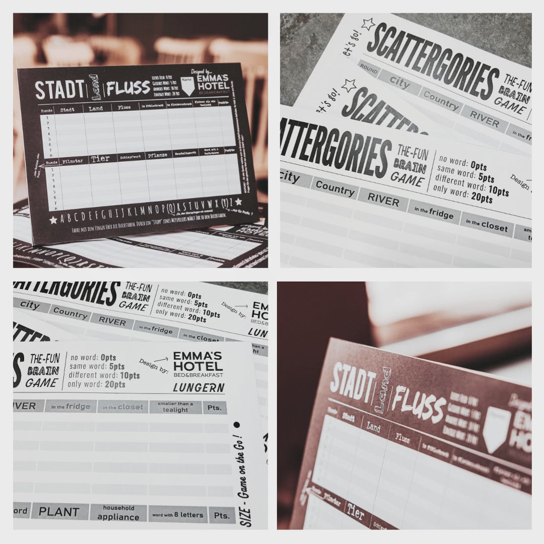 Disposable paper placemats featuring the classic Scattergories game in English. Perfect for cafés, family dinners or rainy-day fun. Tear off a sheet, pick a letter and start playing!